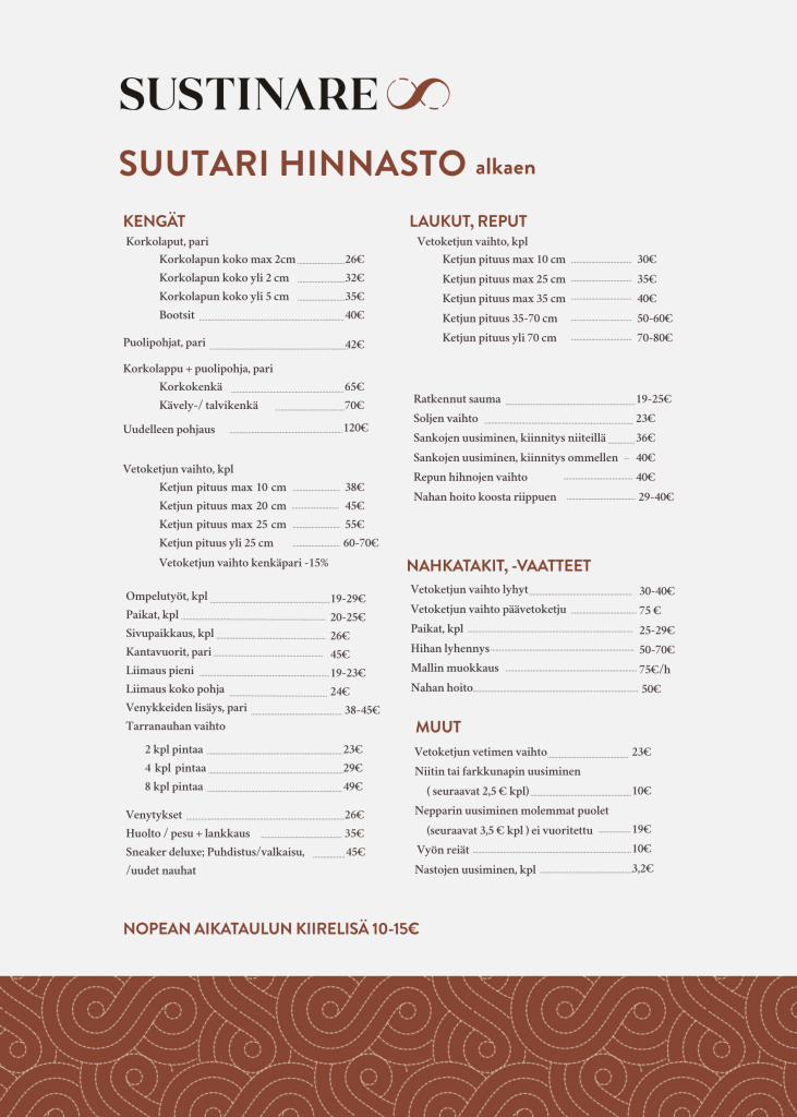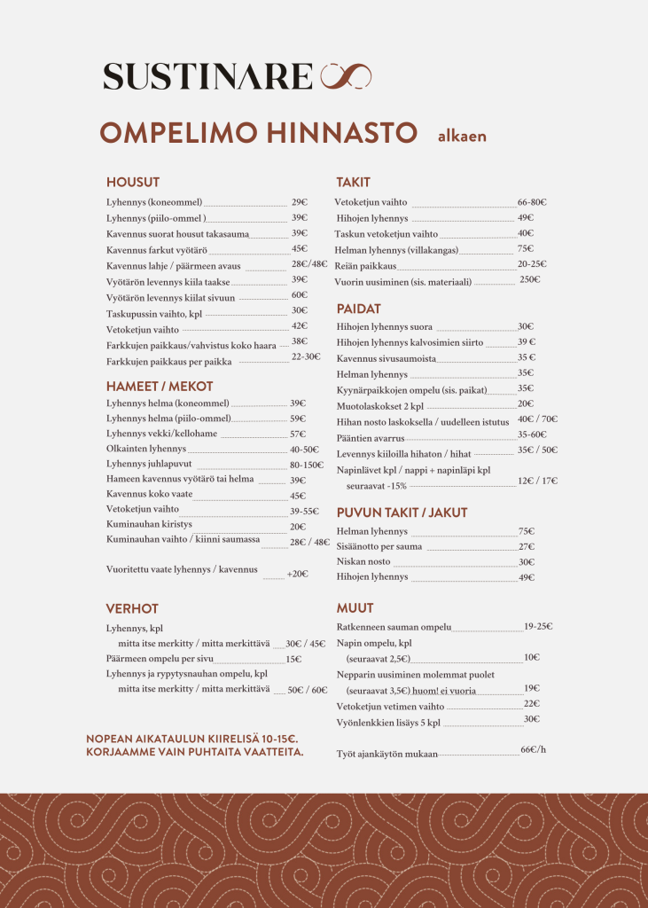 Oheinen hinnasto on suuntaa-antava, jokainen työ hinnoitellaan erikseen materiaalien ja vaativuuden mukaan.